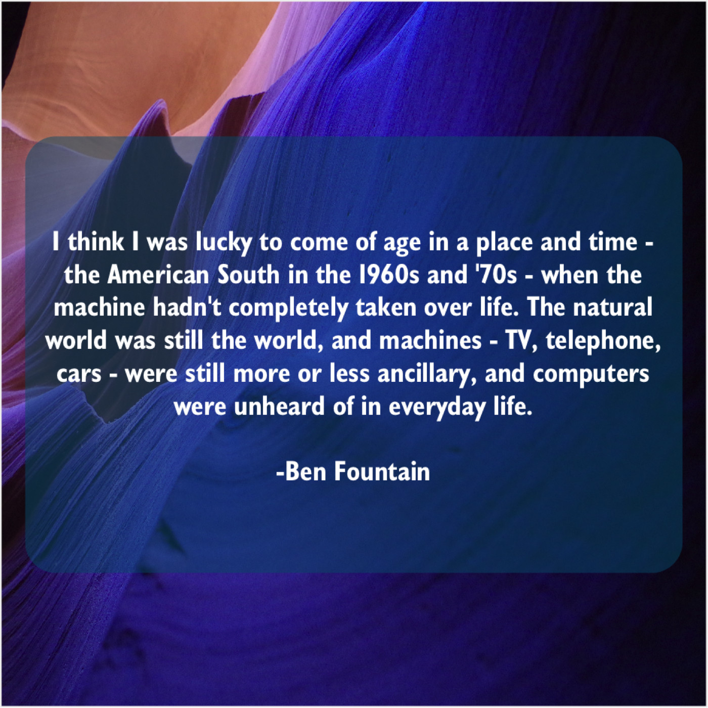“I think I was lucky to come of age in a place and time – the American South in the 1960s and ’70s – when the machine hadn’t completely taken over life. The natural world was still the world, and machines – TV, telephone, cars – were still more or less ancillary, and computers were unheard of in everyday life.”