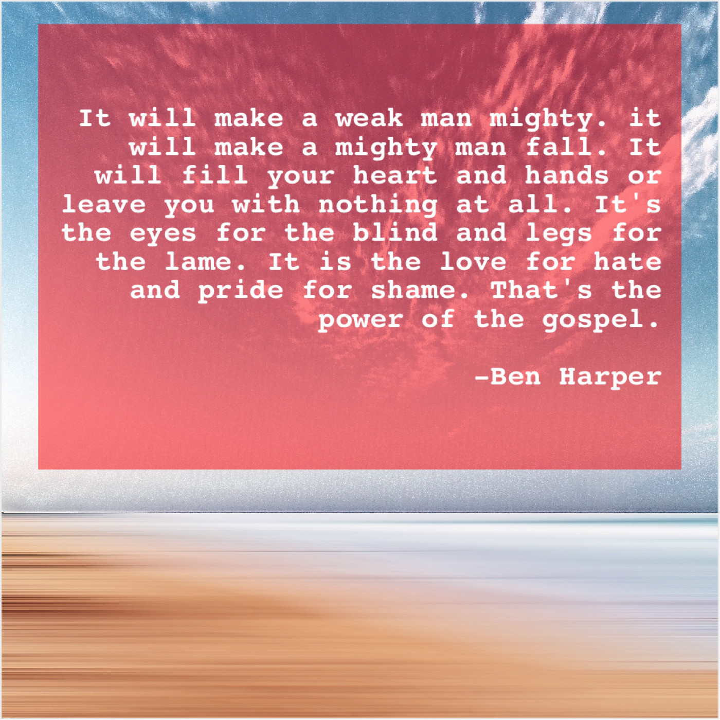 “It will make a weak man mighty. it will make a mighty man fall. It will fill your heart and hands or leave you with nothing at all. It’s the eyes for the blind and legs for the lame. It is the love for hate and pride for shame. That’s the power of the gospel.”