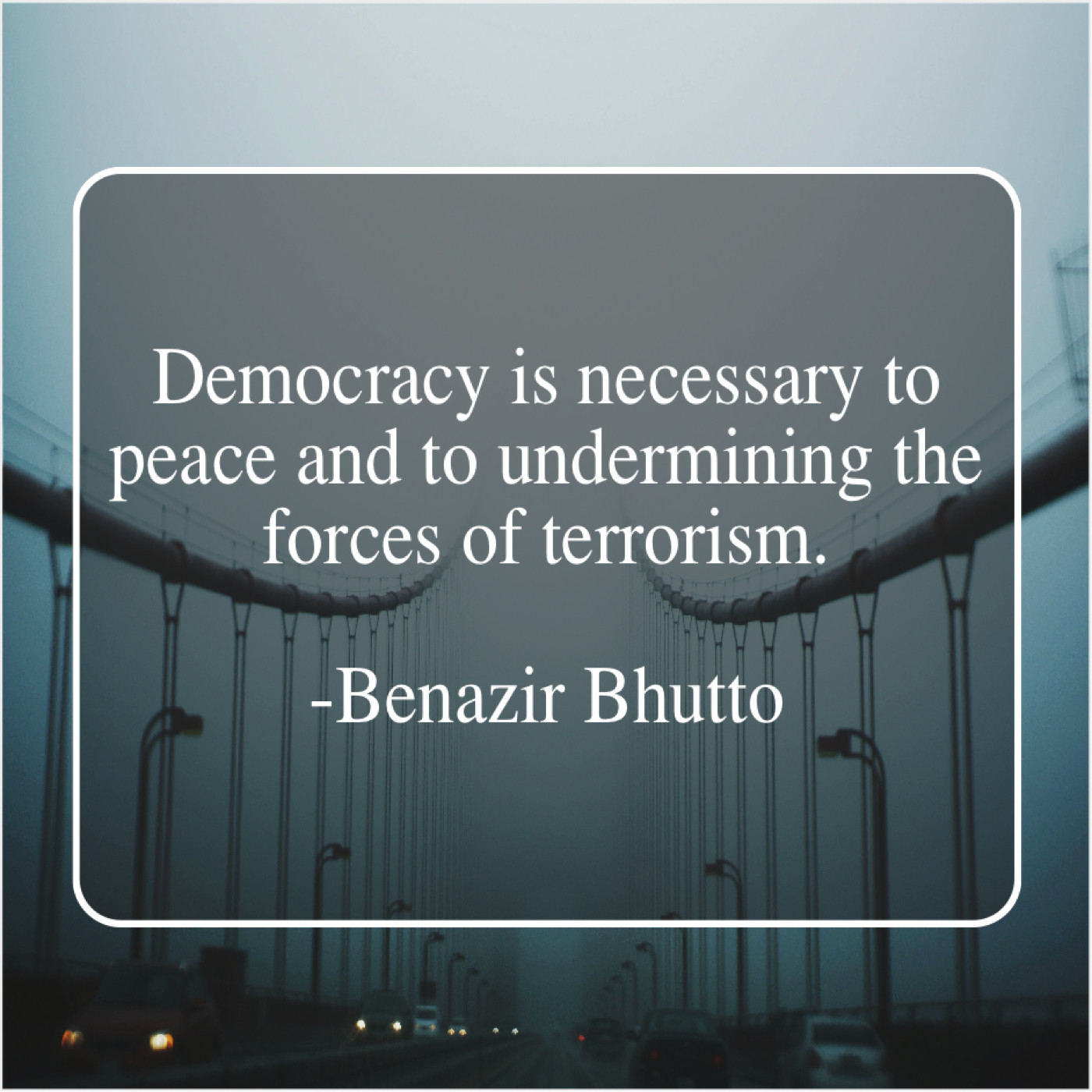Benazir Bhutto Benazir Bhutto – Democracy is necessary to peace… April 10, 2019 admin “Democracy is necessary to peace and to undermining the forces of terrorism.”-Benazir Bhutto