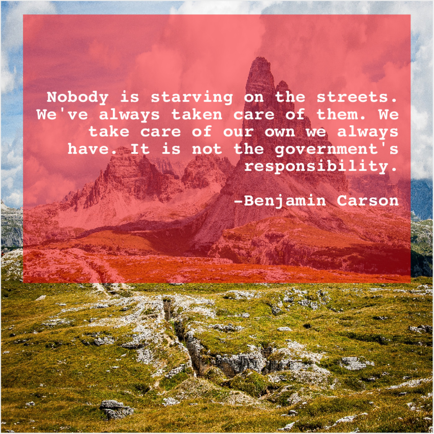 Benjamin Carson Benjamin Carson – Nobody is starving on the… April 17, 2019 admin “Nobody is starving on the streets. We’ve always taken care of them. We take care of our own we always have. It is not the government’s responsibility.”-Benjamin Carson