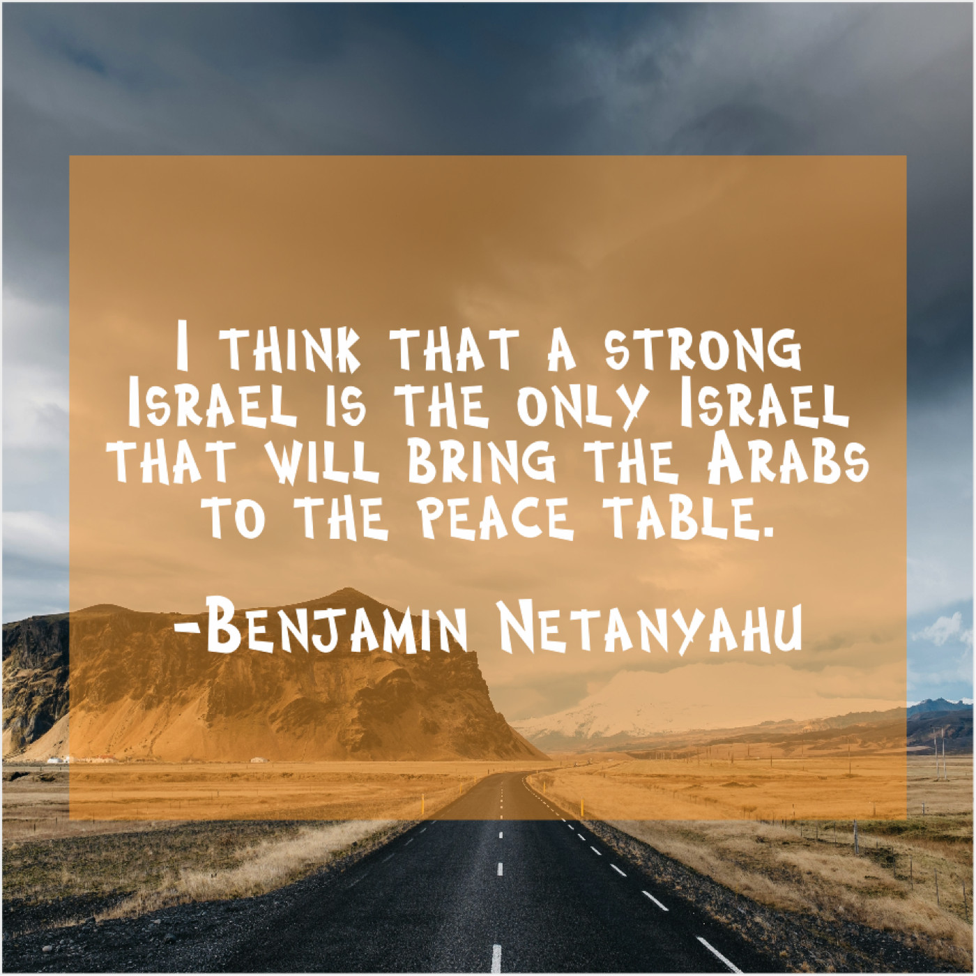 Benjamin Netanyahu Benjamin Netanyahu – I think that a strong… June 6, 2019 admin “I think that a strong Israel is the only Israel that will bring the Arabs to the peace table.”-Benjamin Netanyahu