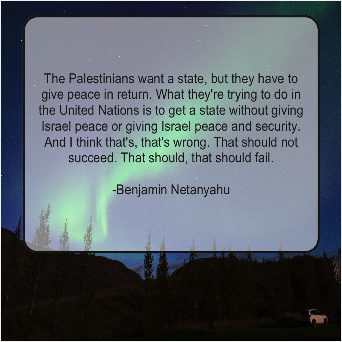 “The Palestinians want a state, but they have to give peace in return. What they’re trying to do in the United Nations is to get a state without giving Israel peace or giving Israel peace and security. And I think that’s, that’s wrong. That should not succeed. That should, that should fail.”