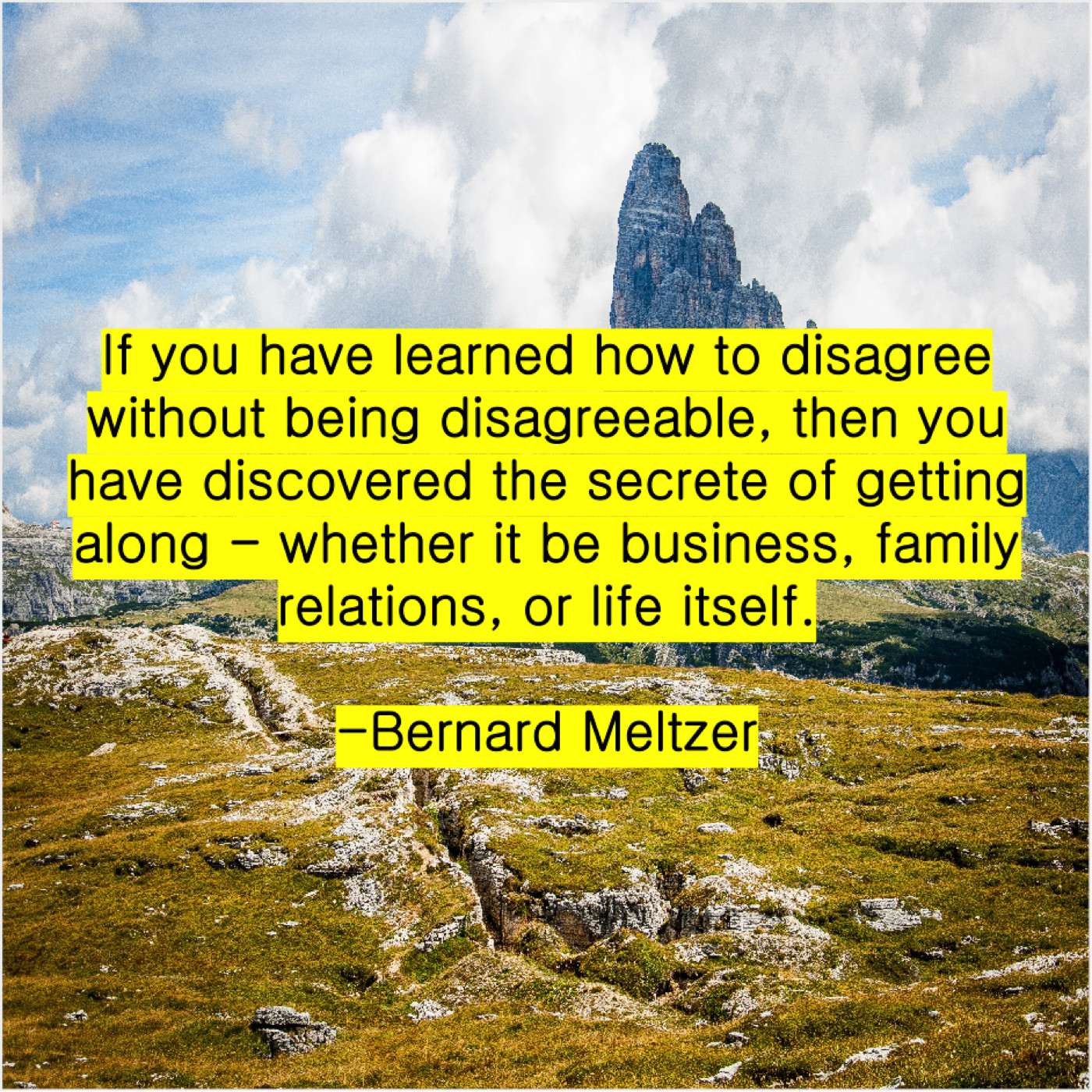 Bernard Meltzer Bernard Meltzer – If you have learned how… June 3, 2019 admin “If you have learned how to disagree without being disagreeable, then you have discovered the secrete of getting along – whether it be business, family relations, or life itself.”-Bernard Meltzer