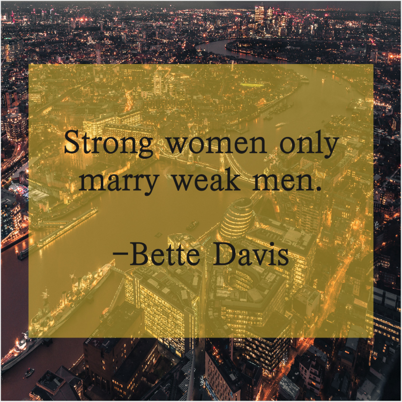Bette Davis Bette Davis – Strong women only marry weak… January 1, 2019 admin “Strong women only marry weak men.”-Bette Davis