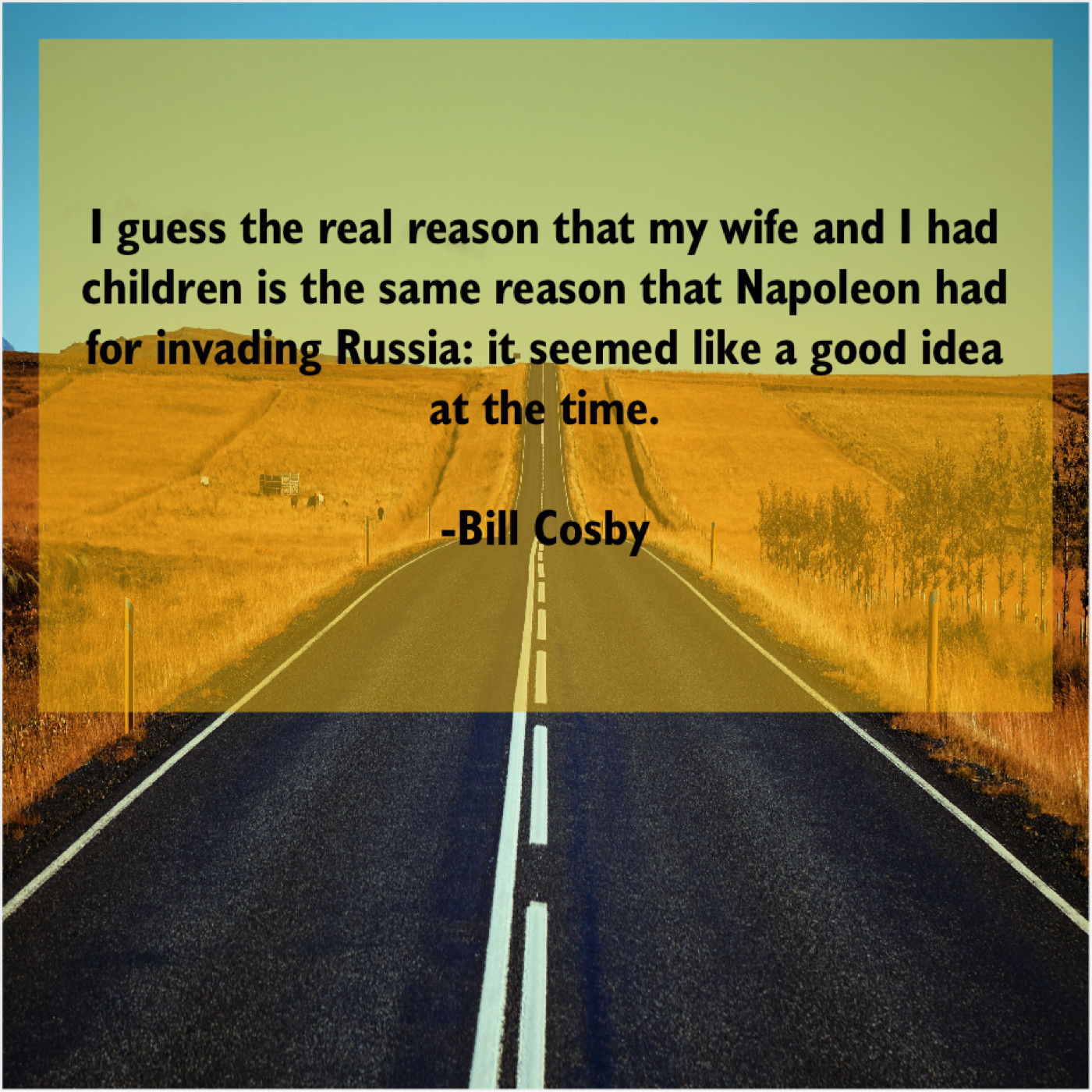 Bill Cosby Bill Cosby – I guess the real reason… October 21, 2019 admin “I guess the real reason that my wife and I had children is the same reason that Napoleon had for invading Russia: it seemed like a good idea at the time.”-Bill Cosby