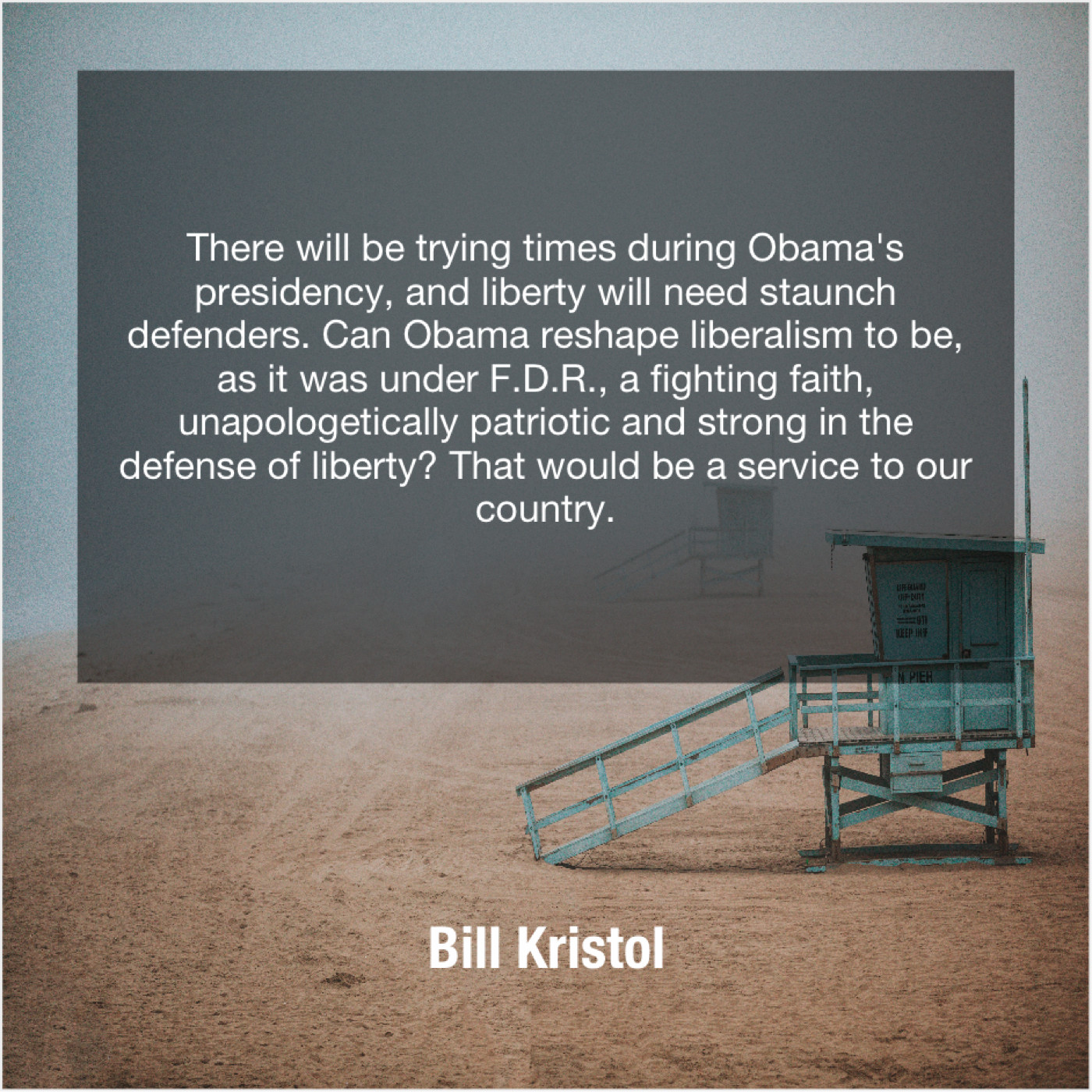 “There will be trying times during Obama’s presidency, and liberty will need staunch defenders. Can Obama reshape liberalism to be, as it was under F.D.R., a fighting faith, unapologetically patriotic and strong in the defense of liberty? That would be a service to our country.”