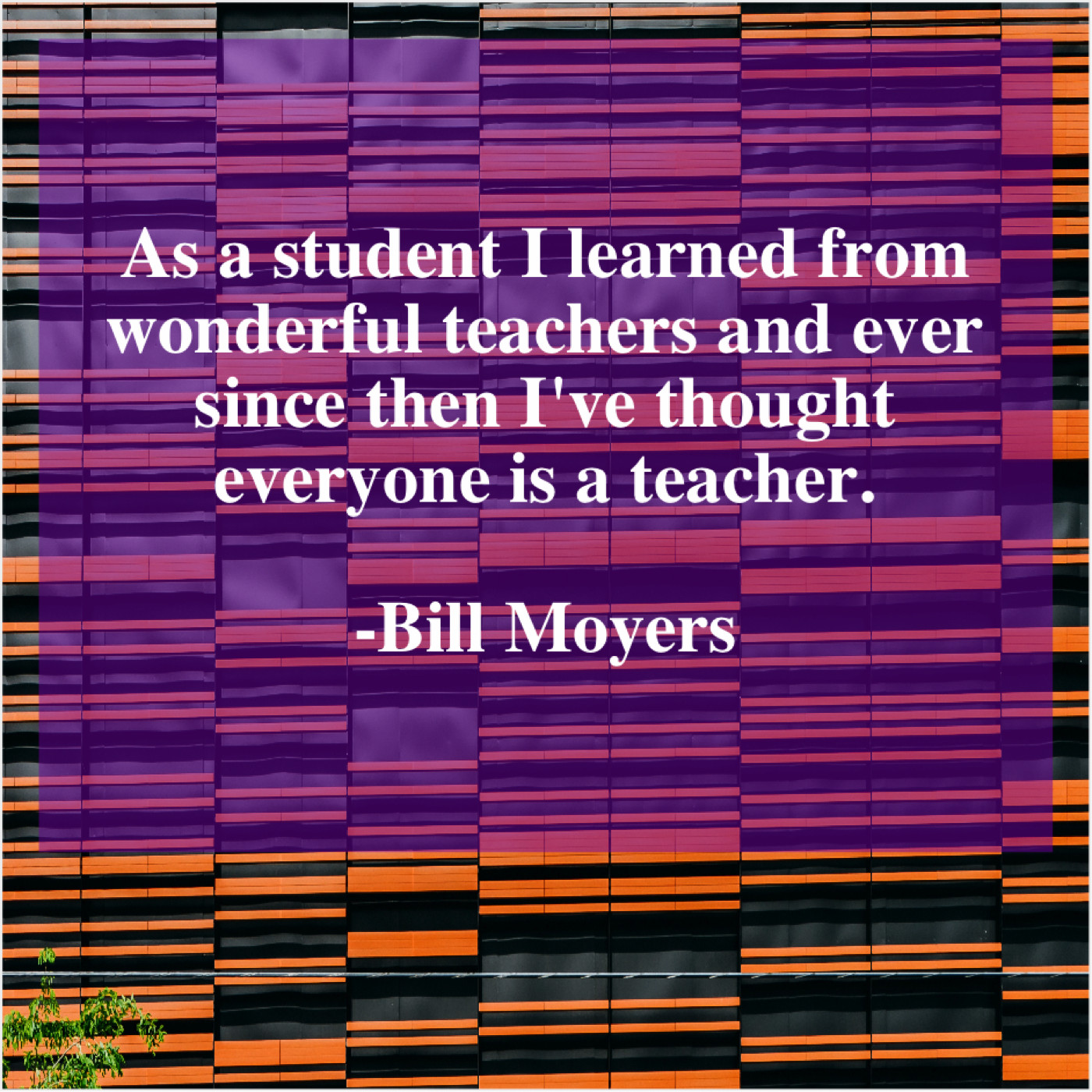 Bill Moyers Bill Moyers – As a student I learned… May 19, 2019 admin “As a student I learned from wonderful teachers and ever since then I’ve thought everyone is a teacher.”-Bill Moyers