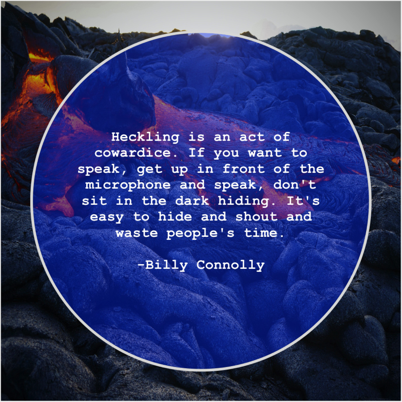 Billy Connolly Billy Connolly – Heckling is an act of… July 17, 2019 admin “Heckling is an act of cowardice. If you want to speak, get up in front of the microphone and speak, don’t sit in the dark hiding. It’s easy to hide and shout and waste people’s time.”-Billy Connolly