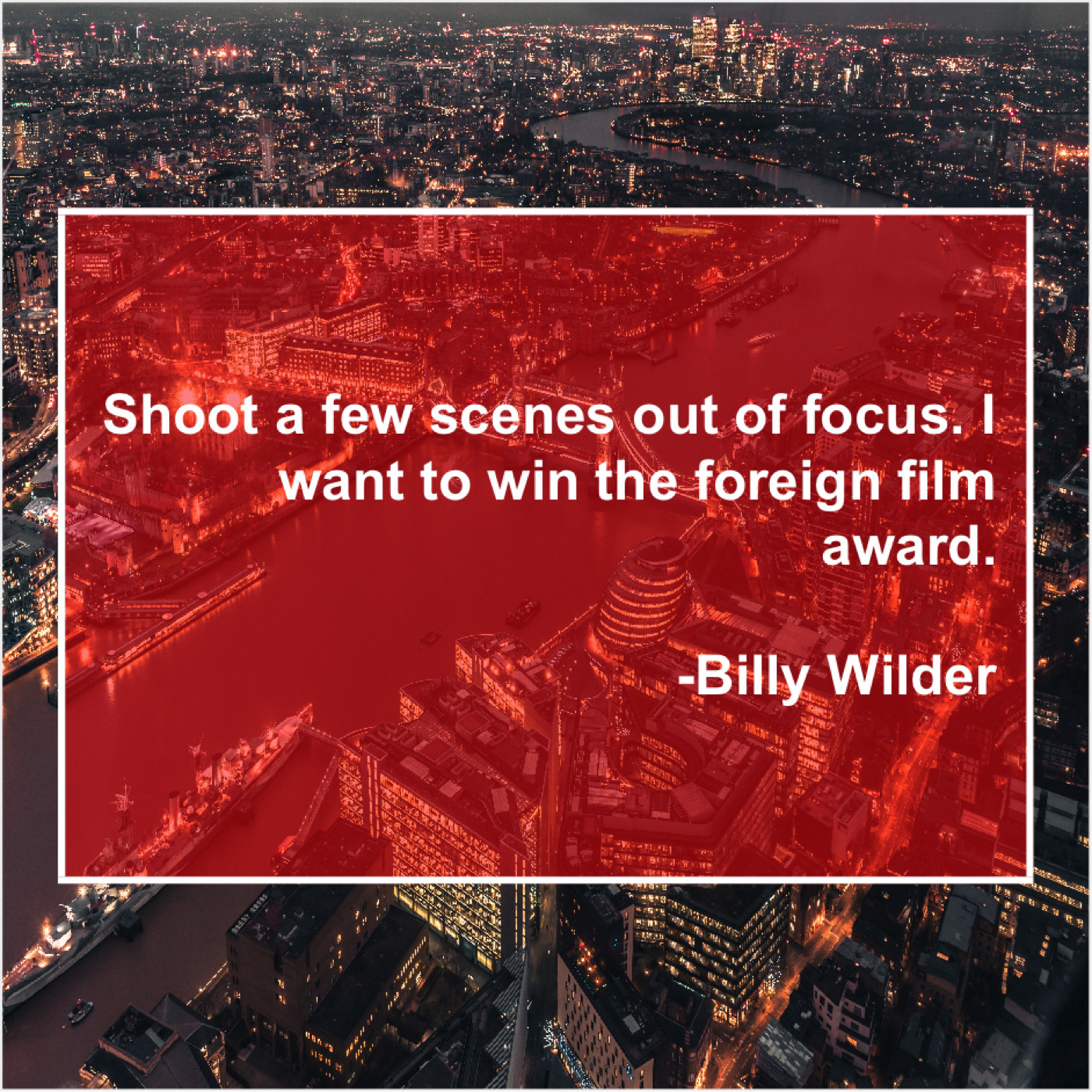 Billy Wilder Billy Wilder – Shoot a few scenes out… December 21, 2018 admin “Shoot a few scenes out of focus. I want to win the foreign film award.”-Billy Wilder
