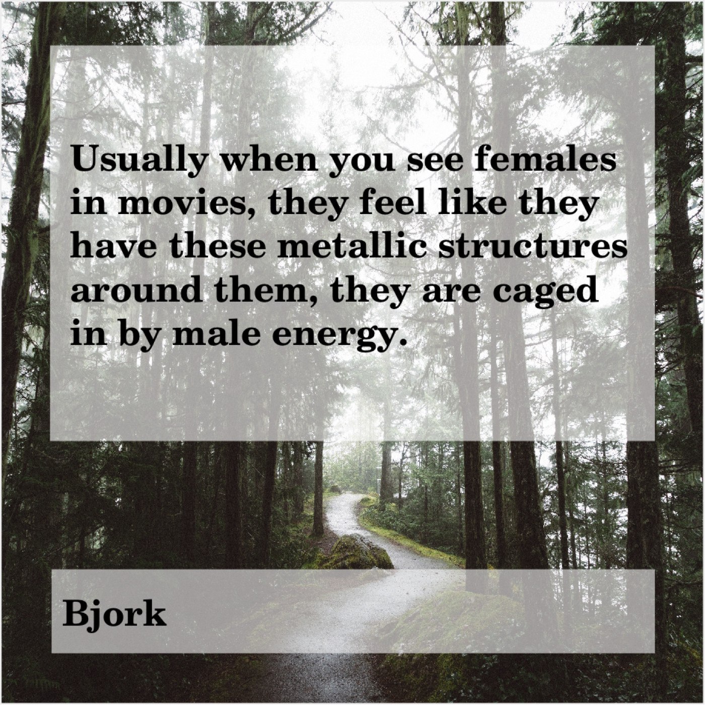 Bjork Bjork – Usually when you see females… September 25, 2019 admin “Usually when you see females in movies, they feel like they have these metallic structures around them, they are caged in by male energy.”-Bjork