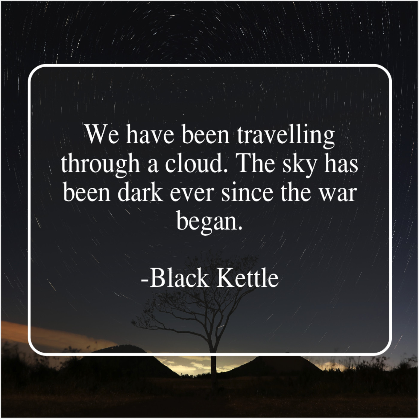Black Kettle Black Kettle – We have been travelling through… November 7, 2018 admin “We have been travelling through a cloud. The sky has been dark ever since the war began.”-Black Kettle