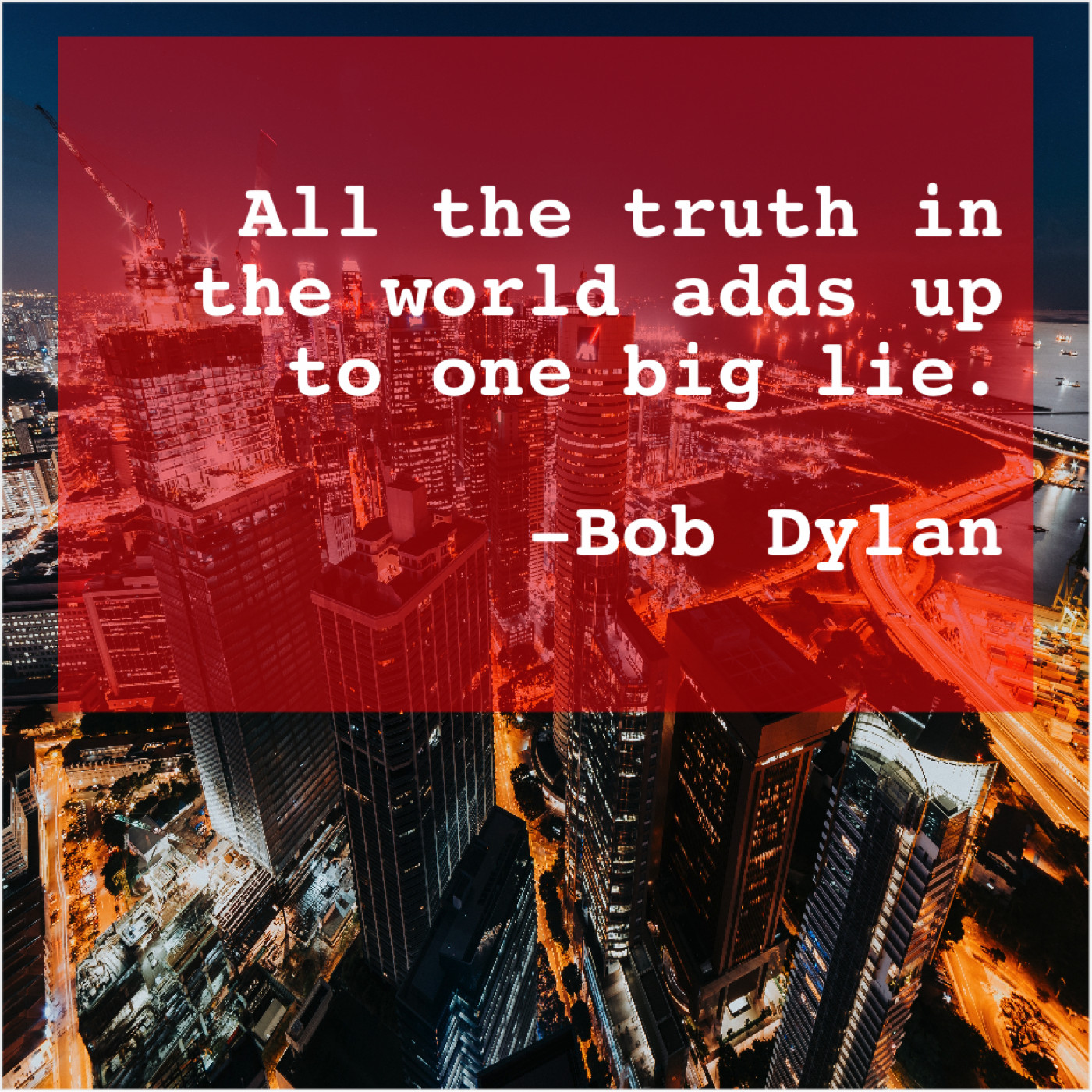 Bob Dylan Bob Dylan – All the truth in the… February 11, 2019 admin “All the truth in the world adds up to one big lie.”-Bob Dylan
