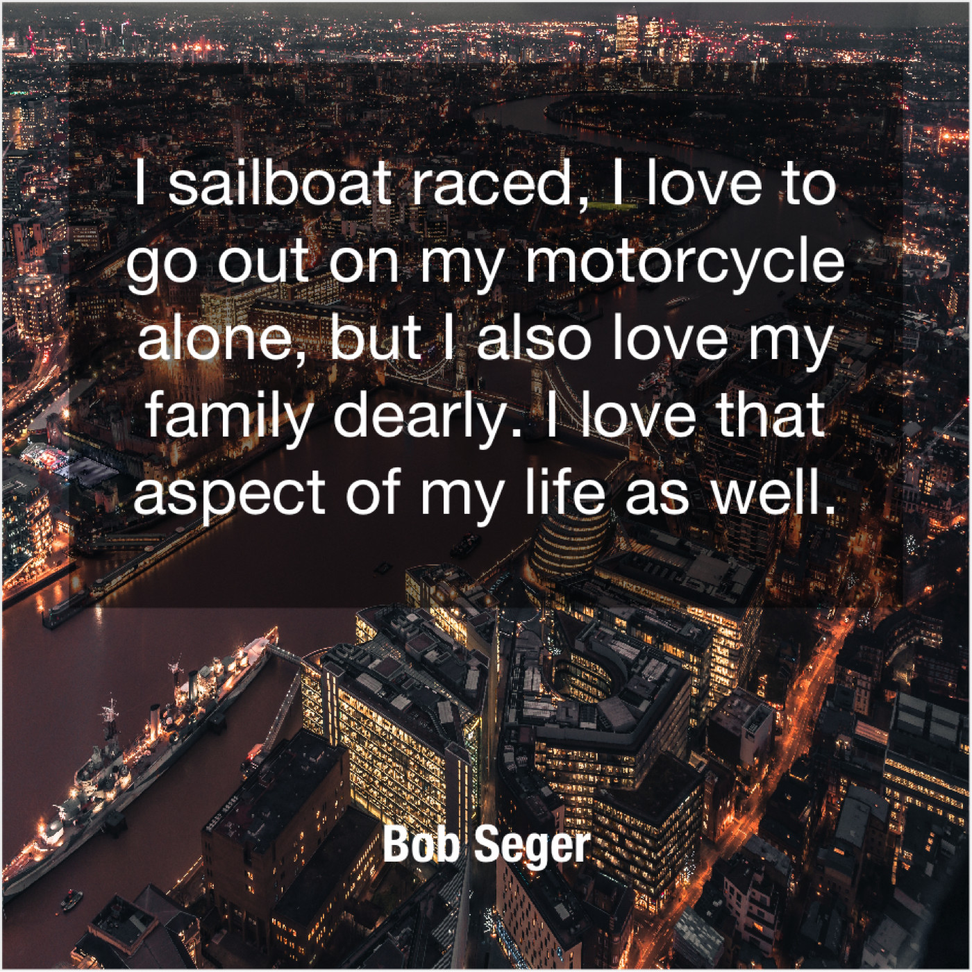 Bob Seger Bob Seger – I sailboat raced, I love… February 14, 2019 admin “I sailboat raced, I love to go out on my motorcycle alone, but I also love my family dearly. I love that aspect of my life as well.”-Bob Seger