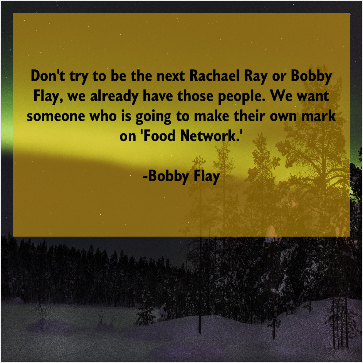 Bobby Flay Bobby Flay – Don’t try to be the… February 2, 2019 admin “Don’t try to be the next Rachael Ray or Bobby Flay, we already have those people. We want someone who is going to make their own mark on ‘Food Network.'”-Bobby Flay
