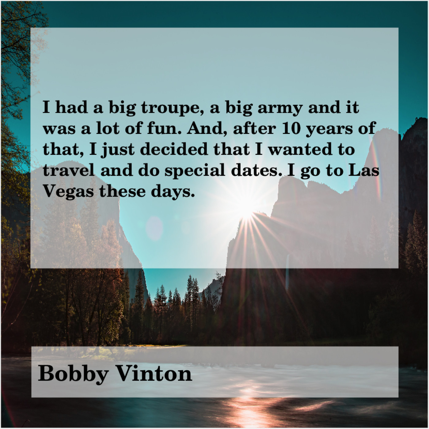 Bobby Vinton Bobby Vinton – I had a big troupe… September 14, 2019 admin “I had a big troupe, a big army and it was a lot of fun. And, after 10 years of that, I just decided that I wanted to travel and do special dates. I go to Las Vegas these days.”-Bobby Vinton