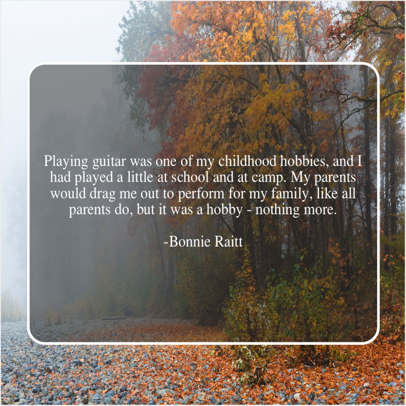 Bonnie Raitt Bonnie Raitt – Playing guitar was one of… June 23, 2019 admin “Playing guitar was one of my childhood hobbies, and I had played a little at school and at camp. My parents would drag me out to perform for my family, like all parents do, but it was a hobby – nothing more.”-Bonnie Raitt