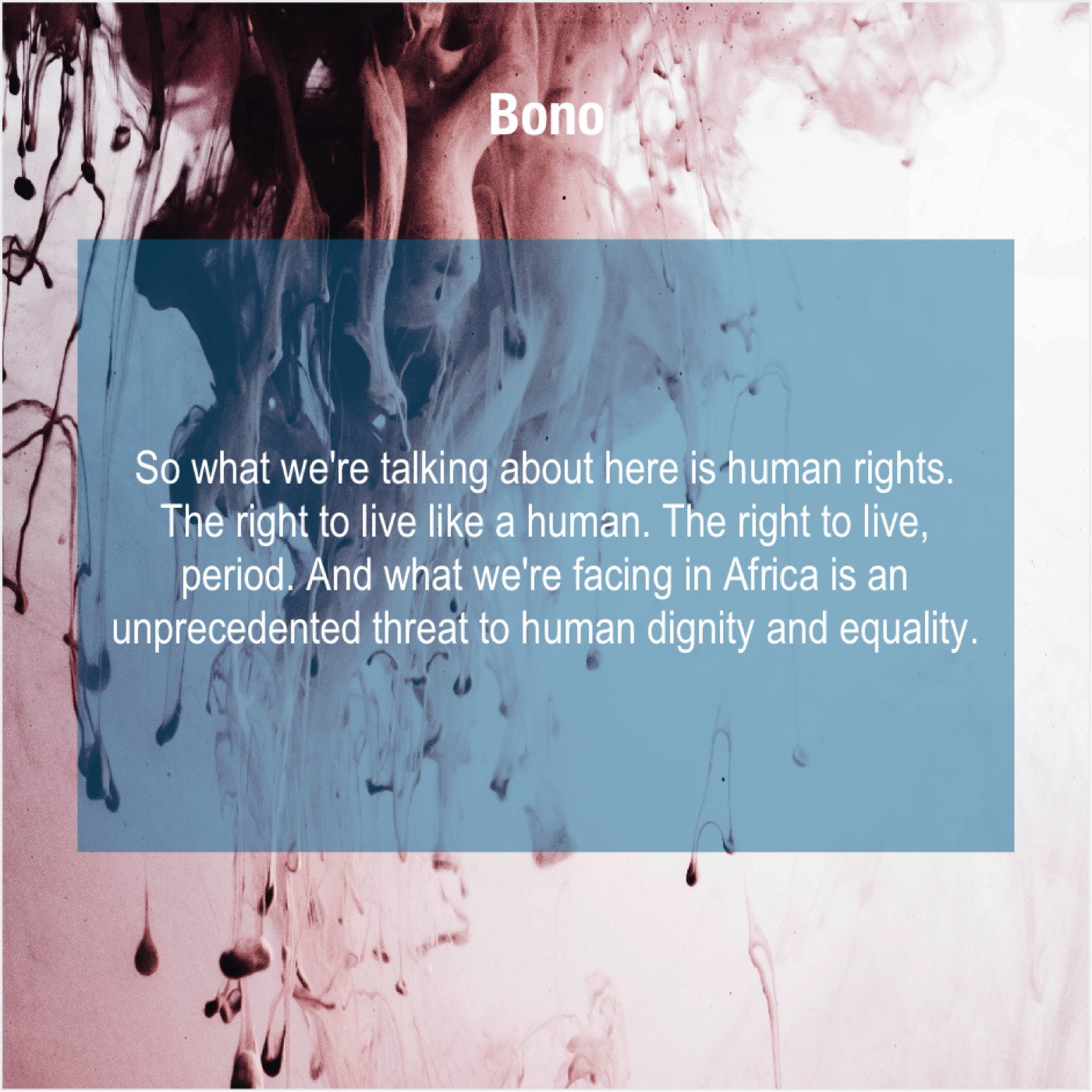 Bono Bono – So what we’re talking about… April 24, 2019 admin “So what we’re talking about here is human rights. The right to live like a human. The right to live, period. And what we’re facing in Africa is an unprecedented threat to human dignity and equality.”-Bono