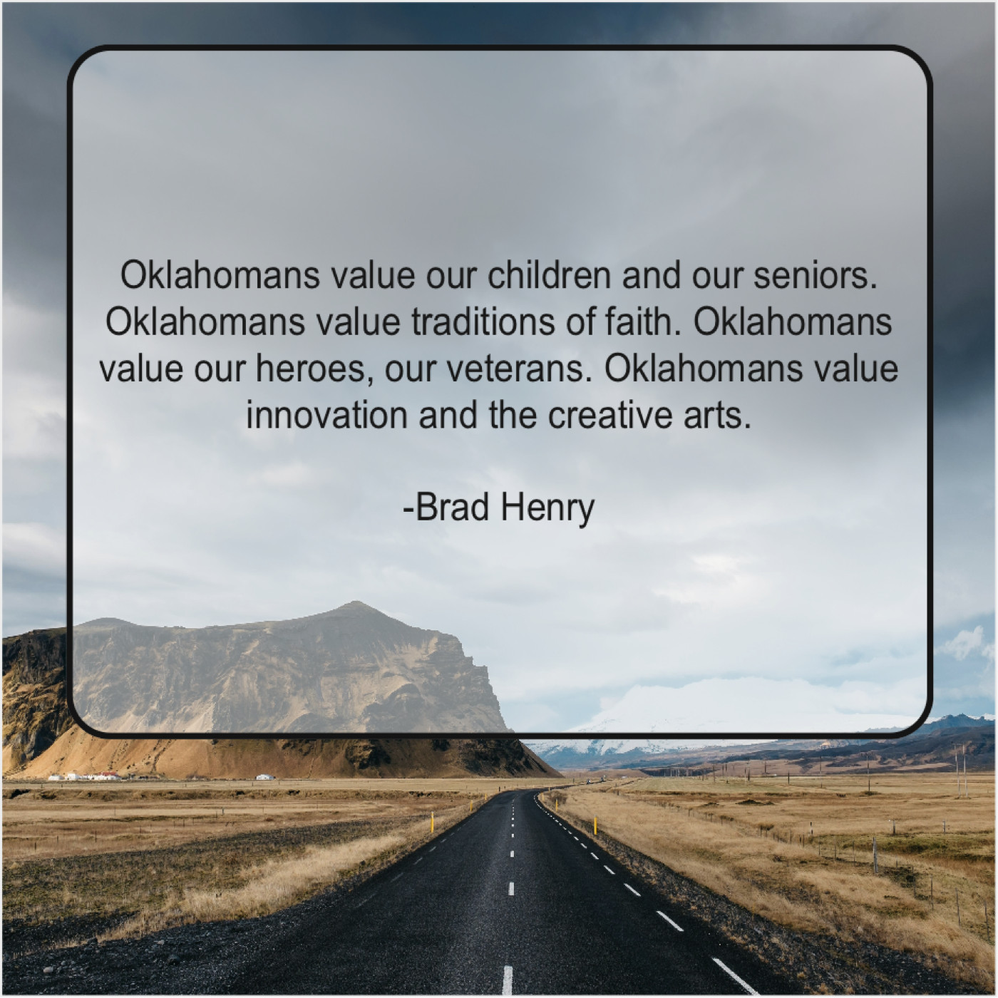 Brad Henry Brad Henry – Oklahomans value our children and… October 31, 2018 admin “Oklahomans value our children and our seniors. Oklahomans value traditions of faith. Oklahomans value our heroes, our veterans. Oklahomans value innovation and the creative arts.”-Brad Henry