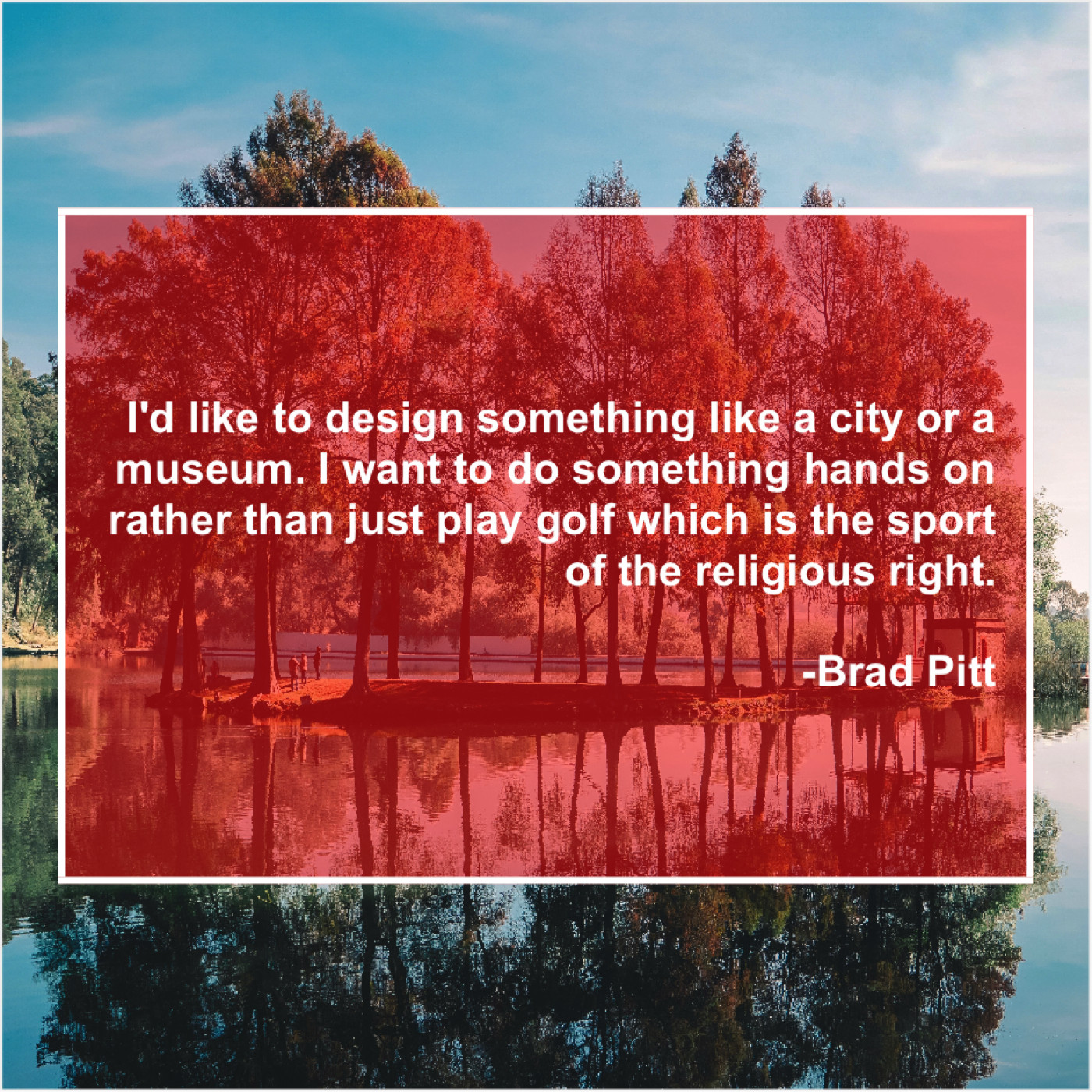 Brad Pitt Brad Pitt – I’d like to design something… April 16, 2019 admin “I’d like to design something like a city or a museum. I want to do something hands on rather than just play golf which is the sport of the religious right.”-Brad Pitt
