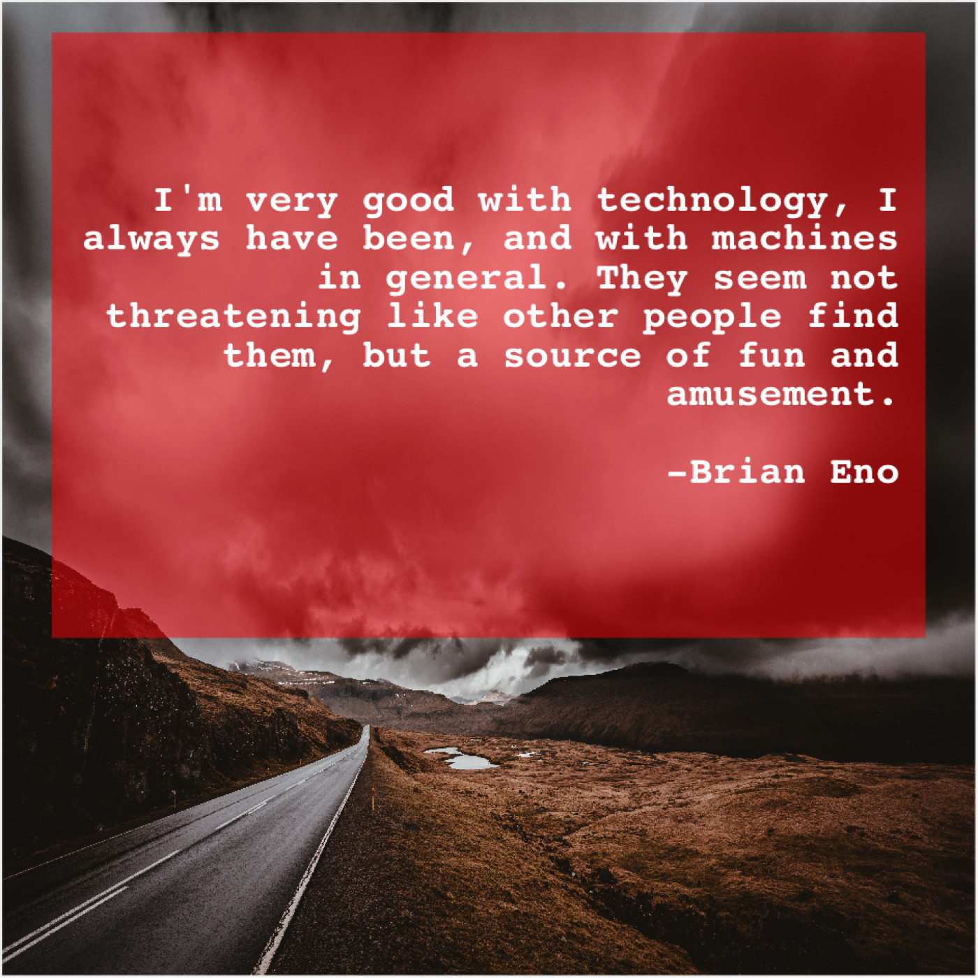 Brian Eno Brian Eno – I’m very good with technology… June 20, 2019 admin “I’m very good with technology, I always have been, and with machines in general. They seem not threatening like other people find them, but a source of fun and amusement.”-Brian Eno
