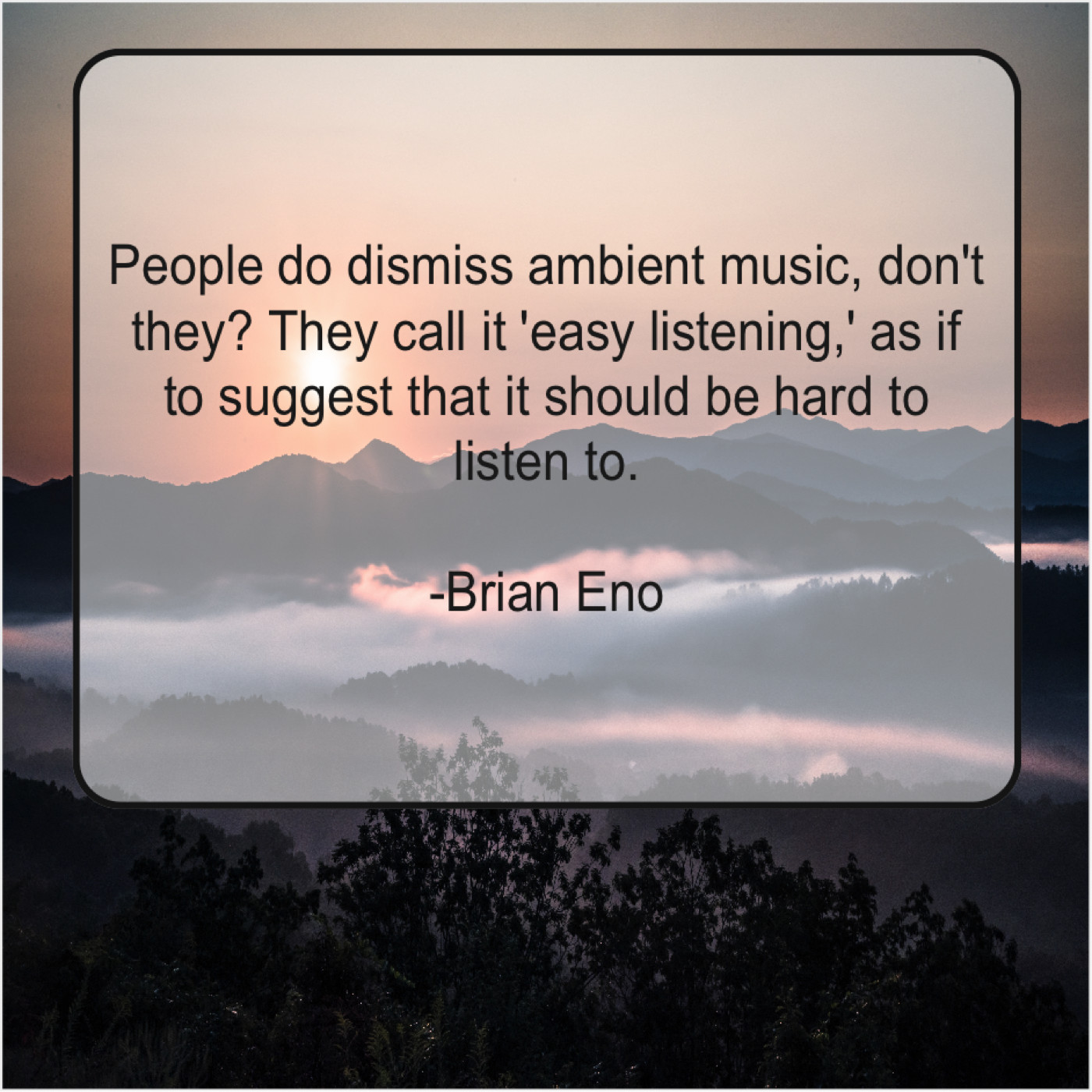 Brian Eno Brian Eno – People do dismiss ambient music… August 18, 2019 admin “People do dismiss ambient music, don’t they? They call it ‘easy listening,’ as if to suggest that it should be hard to listen to.”-Brian Eno