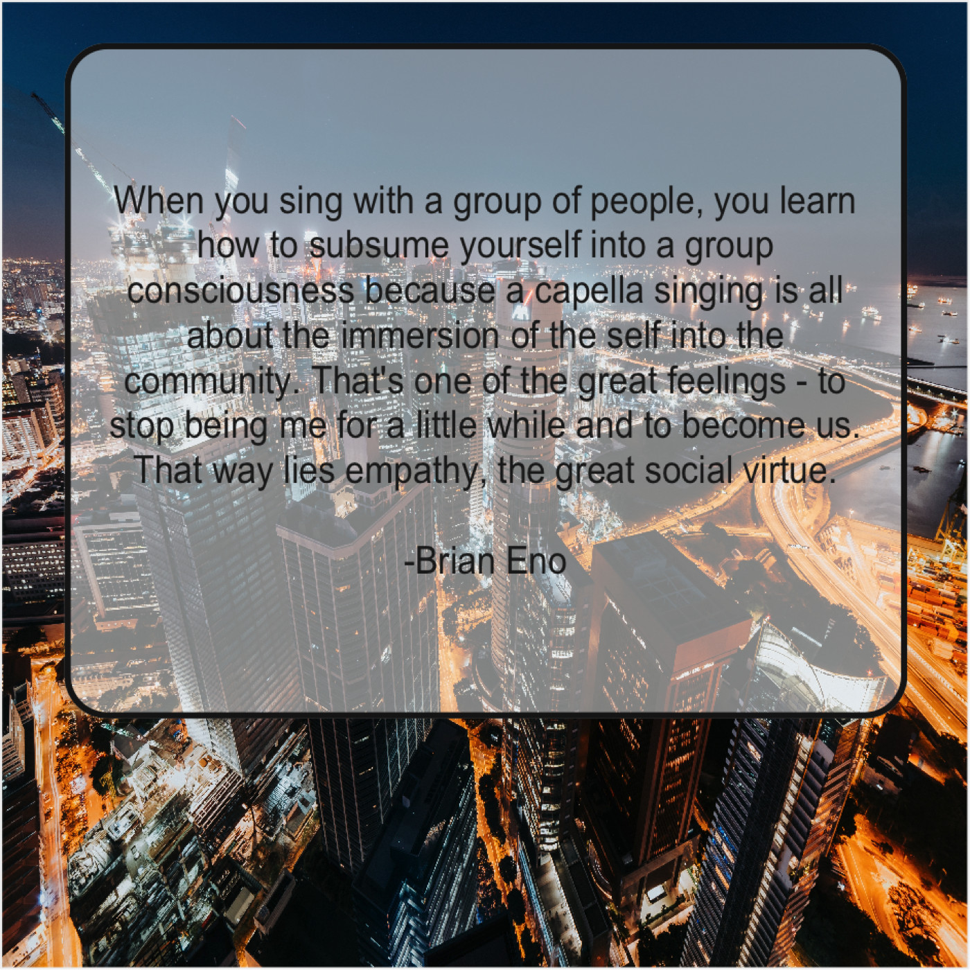 “When you sing with a group of people, you learn how to subsume yourself into a group consciousness because a capella singing is all about the immersion of the self into the community. That’s one of the great feelings – to stop being me for a little while and to become us. That way lies empathy, the great social virtue.”