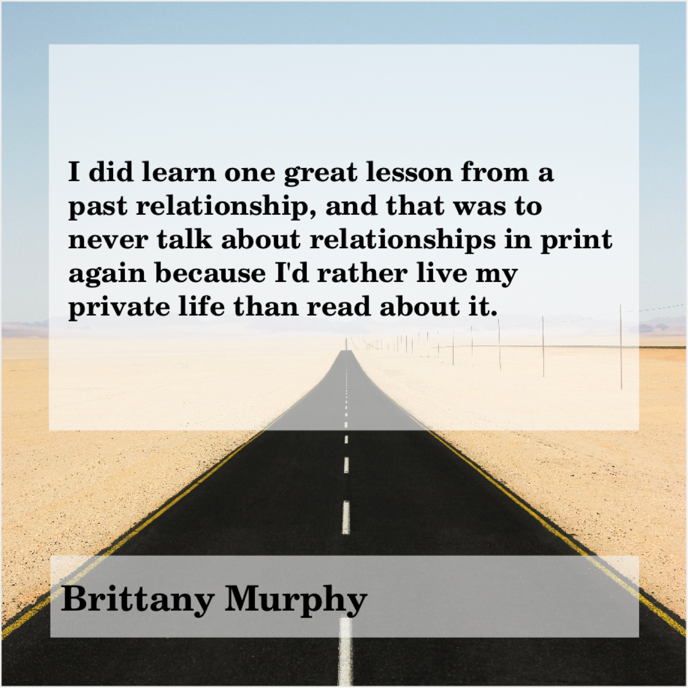 Brittany Murphy Brittany Murphy – I did learn one great… February 3, 2019 admin “I did learn one great lesson from a past relationship, and that was to never talk about relationships in print again because I’d rather live my private life than read about it.”-Brittany Murphy