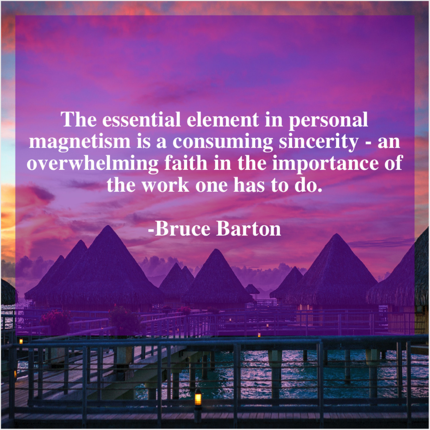 Bruce Barton Bruce Barton – The essential element in personal… September 21, 2019 admin “The essential element in personal magnetism is a consuming sincerity – an overwhelming faith in the importance of the work one has to do.”-Bruce Barton