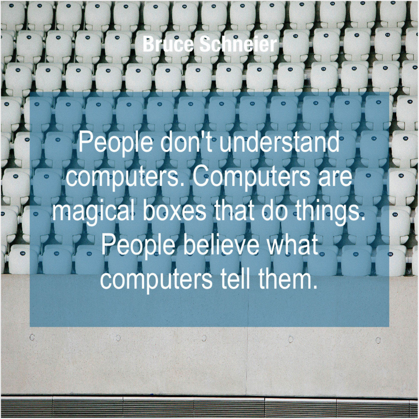 Bruce Schneier Bruce Schneier – People don’t understand computers. Computers… June 7, 2019 admin “People don’t understand computers. Computers are magical boxes that do things. People believe what computers tell them.”-Bruce Schneier