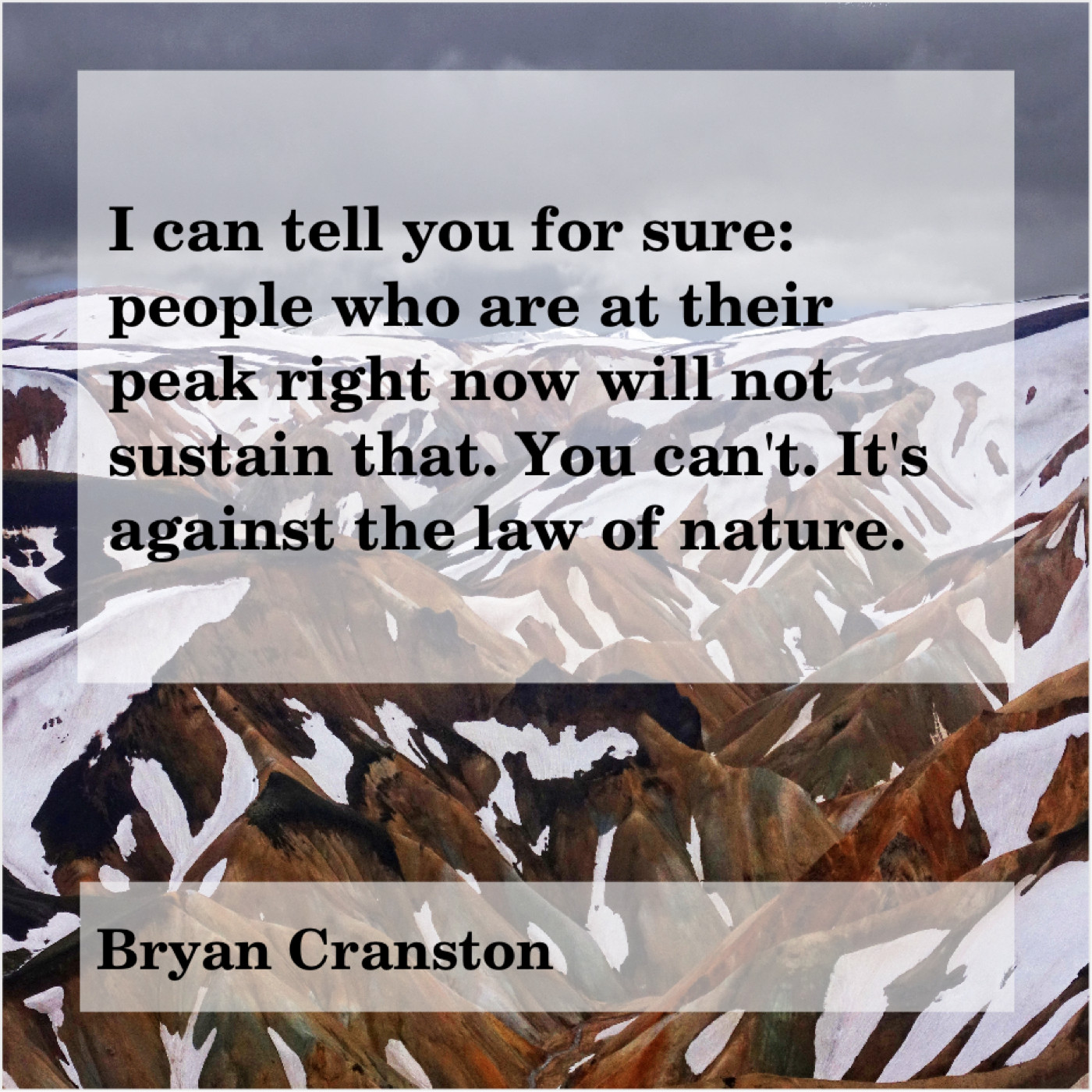 Bryan Cranston Bryan Cranston – I can tell you for… June 12, 2019 admin “I can tell you for sure: people who are at their peak right now will not sustain that. You can’t. It’s against the law of nature.”-Bryan Cranston