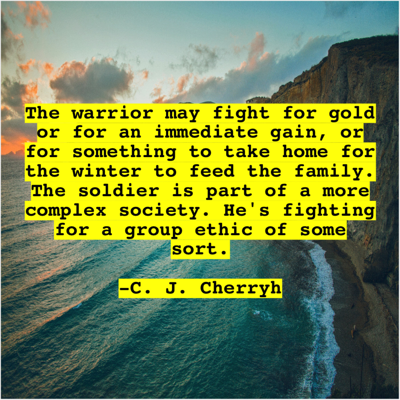 C. J. Cherryh C. J. Cherryh – The warrior may fight for… December 25, 2018 admin “The warrior may fight for gold or for an immediate gain, or for something to take home for the winter to feed the family. The soldier is part of a more complex society. He’s fighting for a group ethic of some sort.”-C. J. Cherryh