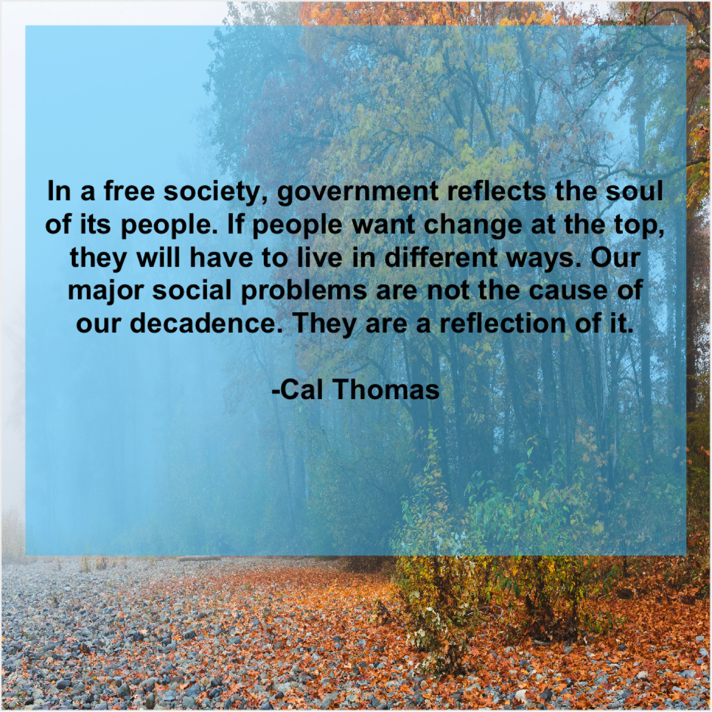 Cal Thomas Cal Thomas – In a free society, government… March 12, 2019 admin “In a free society, government reflects the soul of its people. If people want change at the top, they will have to live in different ways. Our major social problems are not the cause of our decadence. They are a reflection of it.”-Cal Thomas