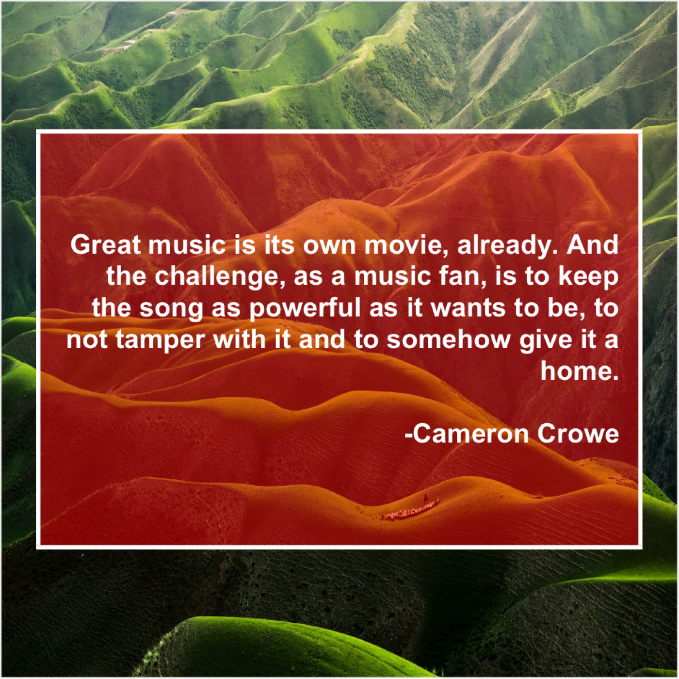 Cameron Crowe Cameron Crowe – Great music is its own… May 17, 2019 admin “Great music is its own movie, already. And the challenge, as a music fan, is to keep the song as powerful as it wants to be, to not tamper with it and to somehow give it a home.”-Cameron Crowe