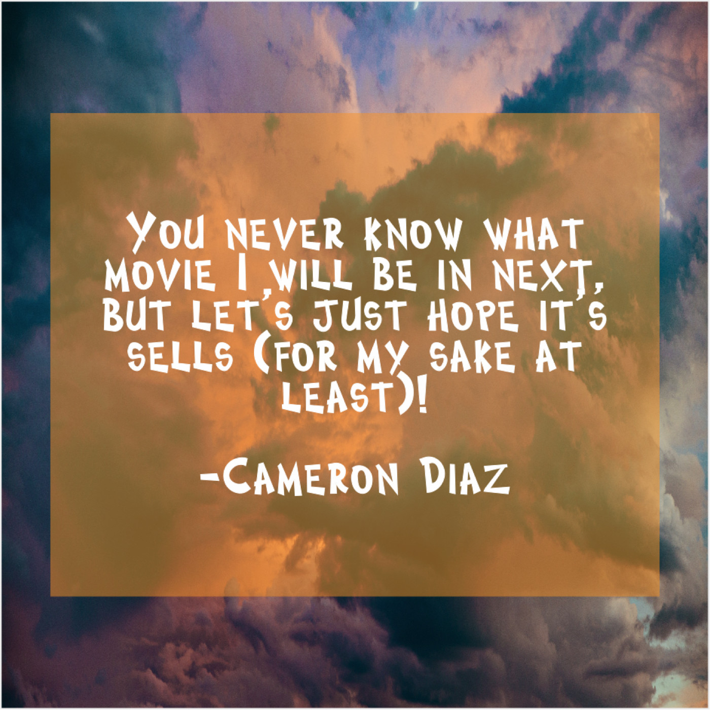 Cameron Diaz Cameron Diaz – You never know what movie… February 18, 2019 admin “You never know what movie I will be in next, but let’s just hope it’s sells (for my sake at least)!”-Cameron Diaz