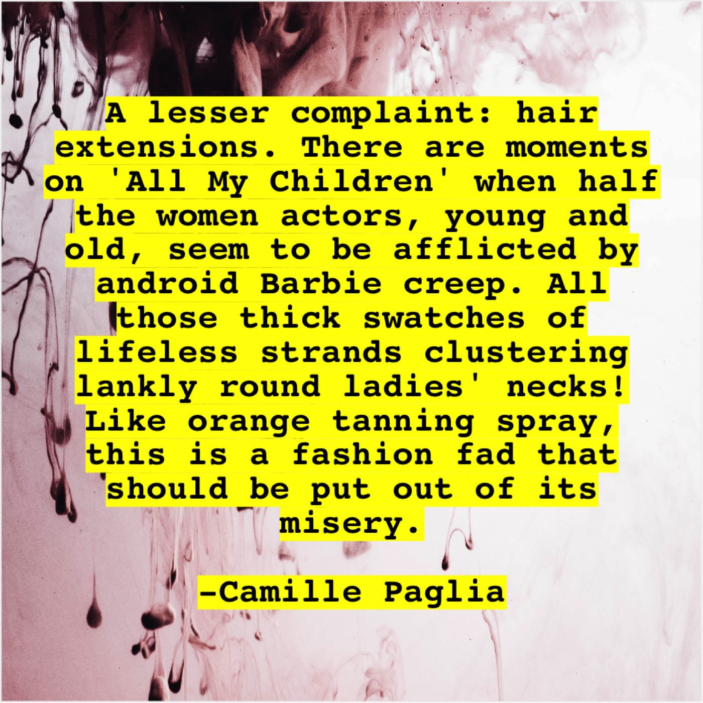 “A lesser complaint: hair extensions. There are moments on ‘All My Children’ when half the women actors, young and old, seem to be afflicted by android Barbie creep. All those thick swatches of lifeless strands clustering lankly round ladies’ necks! Like orange tanning spray, this is a fashion fad that should be put out of its misery.”
