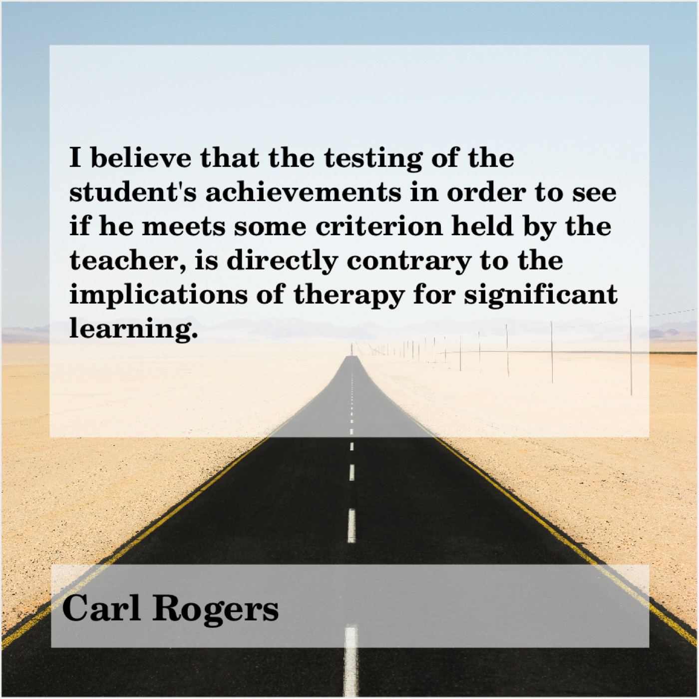 Carl Rogers Carl Rogers – I believe that the testing… April 28, 2019 admin “I believe that the testing of the student’s achievements in order to see if he meets some criterion held by the teacher, is directly contrary to the implications of therapy for significant learning.”-Carl Rogers