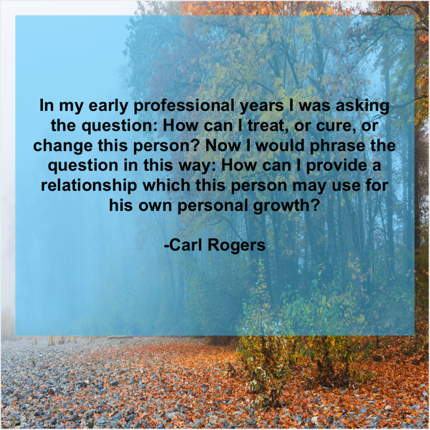 “In my early professional years I was asking the question: How can I treat, or cure, or change this person? Now I would phrase the question in this way: How can I provide a relationship which this person may use for his own personal growth?”