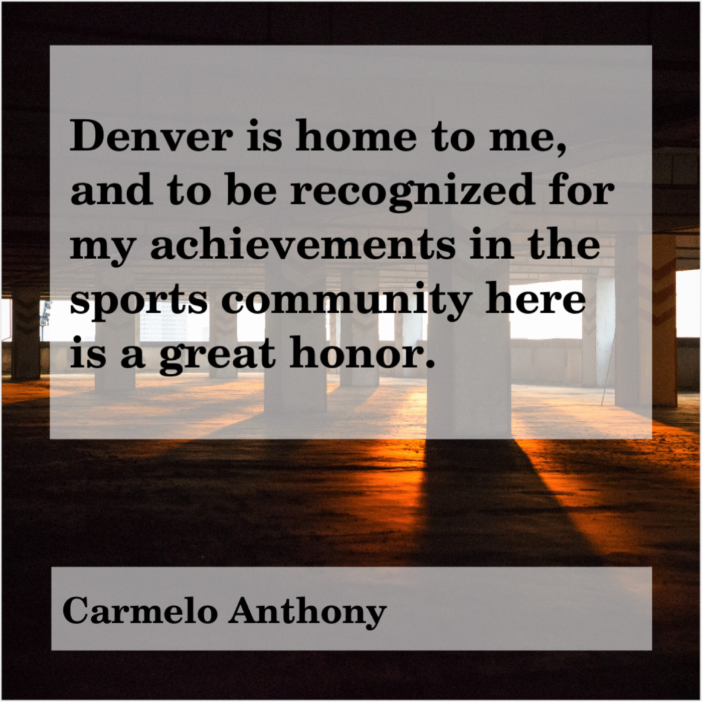 Carmelo Anthony Carmelo Anthony – Denver is home to me… November 2, 2018 admin “Denver is home to me, and to be recognized for my achievements in the sports community here is a great honor.”-Carmelo Anthony