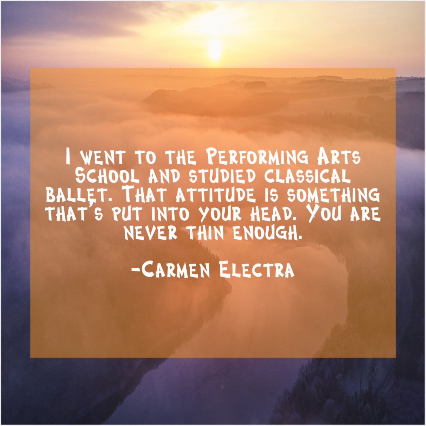 Carmen Electra Carmen Electra – I went to the Performing… August 7, 2019 admin “I went to the Performing Arts School and studied classical ballet. That attitude is something that’s put into your head. You are never thin enough.”-Carmen Electra