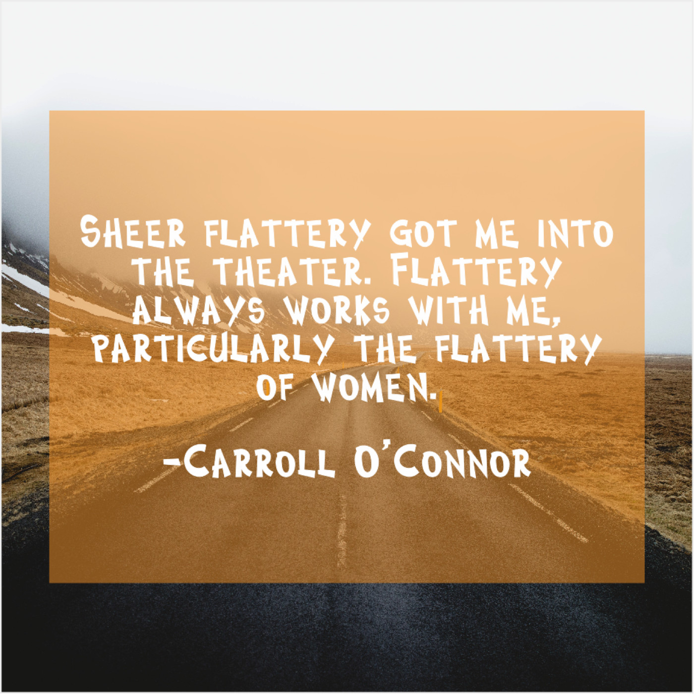 Carroll O'Connor Carroll O’Connor – Sheer flattery got me into… March 21, 2019 admin “Sheer flattery got me into the theater. Flattery always works with me, particularly the flattery of women.”-Carroll O’Connor