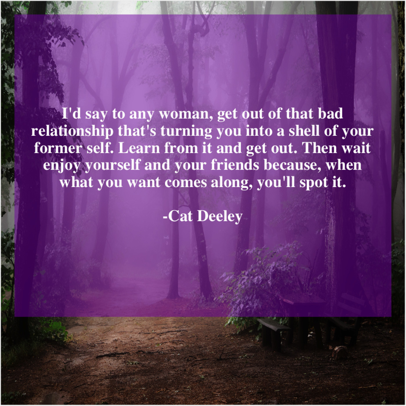 Cat Deeley Cat Deeley – I’d say to any woman… April 9, 2019 admin “I’d say to any woman, get out of that bad relationship that’s turning you into a shell of your former self. Learn from it and get out. Then wait enjoy yourself and your friends because, when what you want comes along, you’ll spot it.”-Cat Deeley