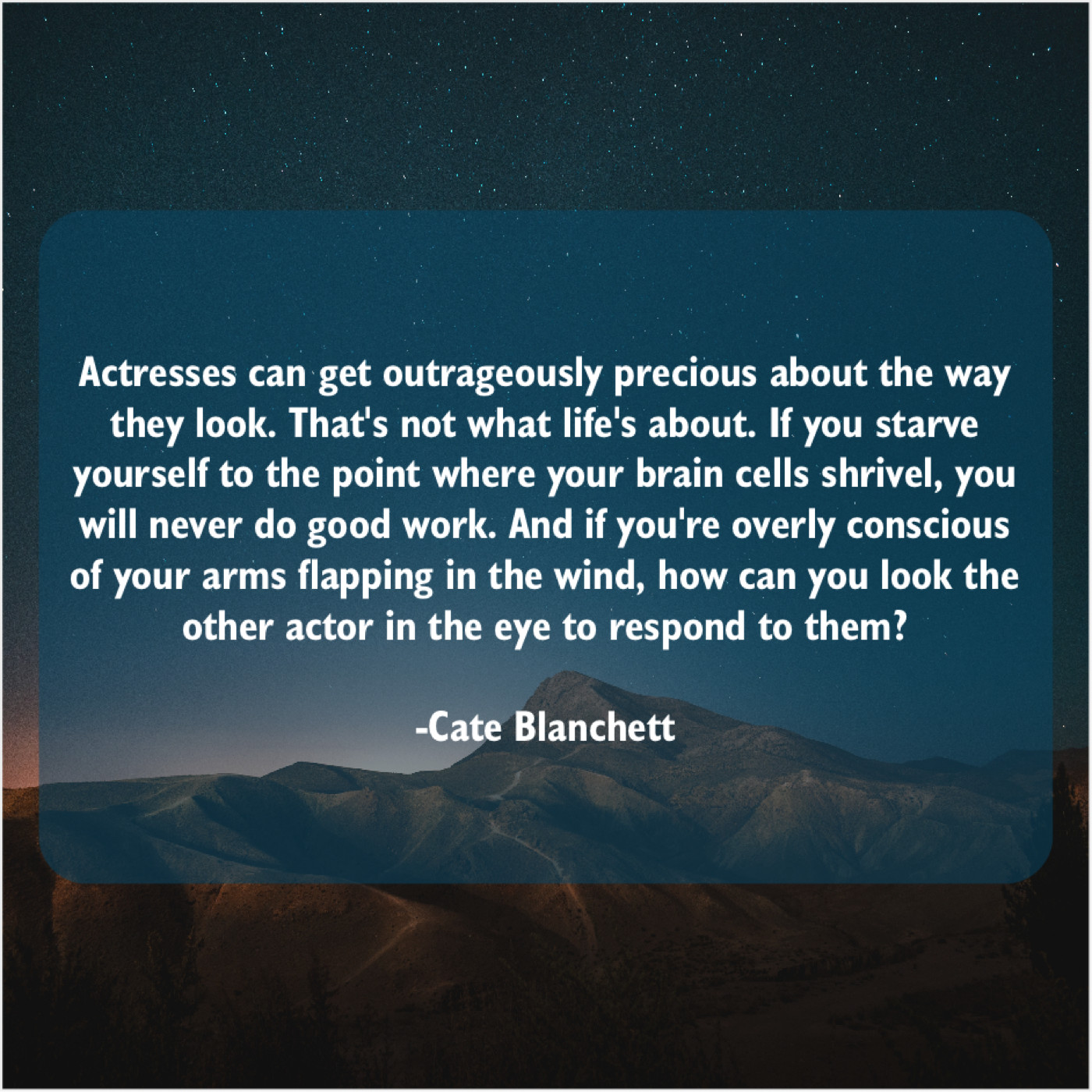 “Actresses can get outrageously precious about the way they look. That’s not what life’s about. If you starve yourself to the point where your brain cells shrivel, you will never do good work. And if you’re overly conscious of your arms flapping in the wind, how can you look the other actor in the eye to respond to them?”