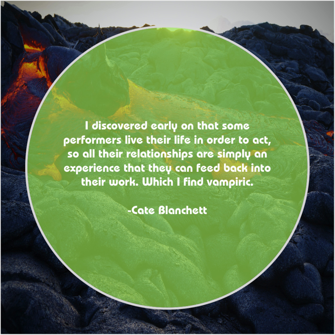 Cate Blanchett Cate Blanchett – I discovered early on that… July 19, 2019 admin “I discovered early on that some performers live their life in order to act, so all their relationships are simply an experience that they can feed back into their work. Which I find vampiric.”-Cate Blanchett