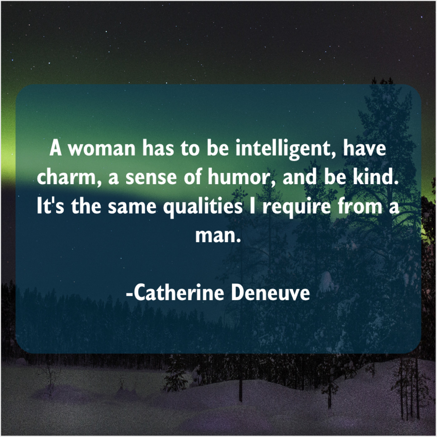 Catherine Deneuve Catherine Deneuve – A woman has to be… April 9, 2019 admin “A woman has to be intelligent, have charm, a sense of humor, and be kind. It’s the same qualities I require from a man.”-Catherine Deneuve