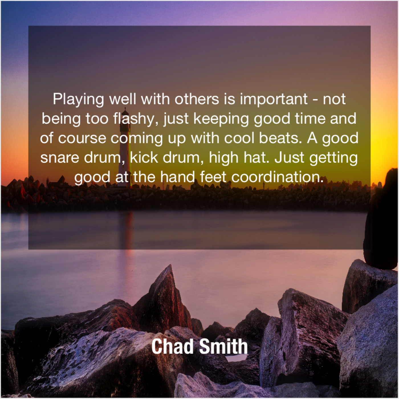 Chad Smith Chad Smith – Playing well with others is… November 28, 2018 admin “Playing well with others is important – not being too flashy, just keeping good time and of course coming up with cool beats. A good snare drum, kick drum, high hat. Just getting good at the hand feet coordination.”-Chad Smith