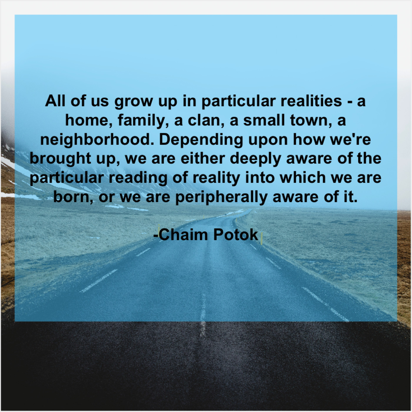 “All of us grow up in particular realities – a home, family, a clan, a small town, a neighborhood. Depending upon how we’re brought up, we are either deeply aware of the particular reading of reality into which we are born, or we are peripherally aware of it.”