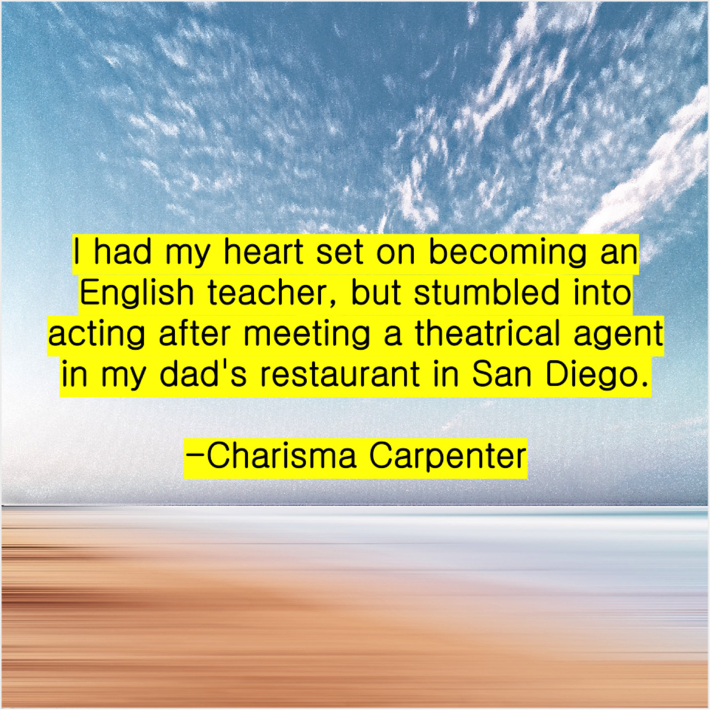 Charisma Carpenter Charisma Carpenter – I had my heart set… August 7, 2019 admin “I had my heart set on becoming an English teacher, but stumbled into acting after meeting a theatrical agent in my dad’s restaurant in San Diego.”-Charisma Carpenter