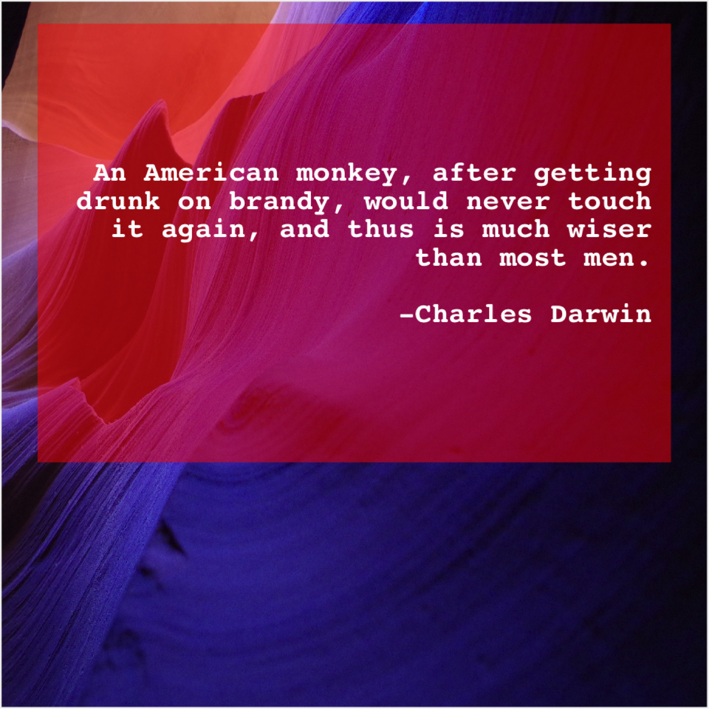 Charles Darwin Charles Darwin – An American monkey, after getting… July 18, 2019 admin “An American monkey, after getting drunk on brandy, would never touch it again, and thus is much wiser than most men.”-Charles Darwin