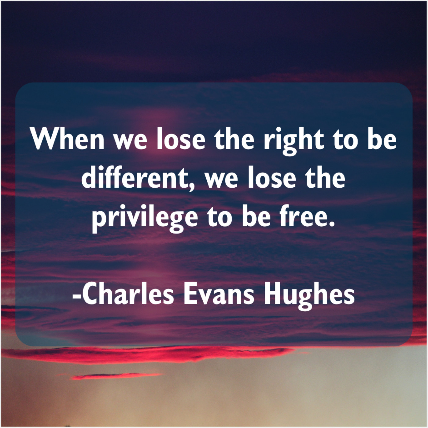 Charles Evans Hughes Charles Evans Hughes – When we lose the right… May 31, 2019 admin “When we lose the right to be different, we lose the privilege to be free.”-Charles Evans Hughes