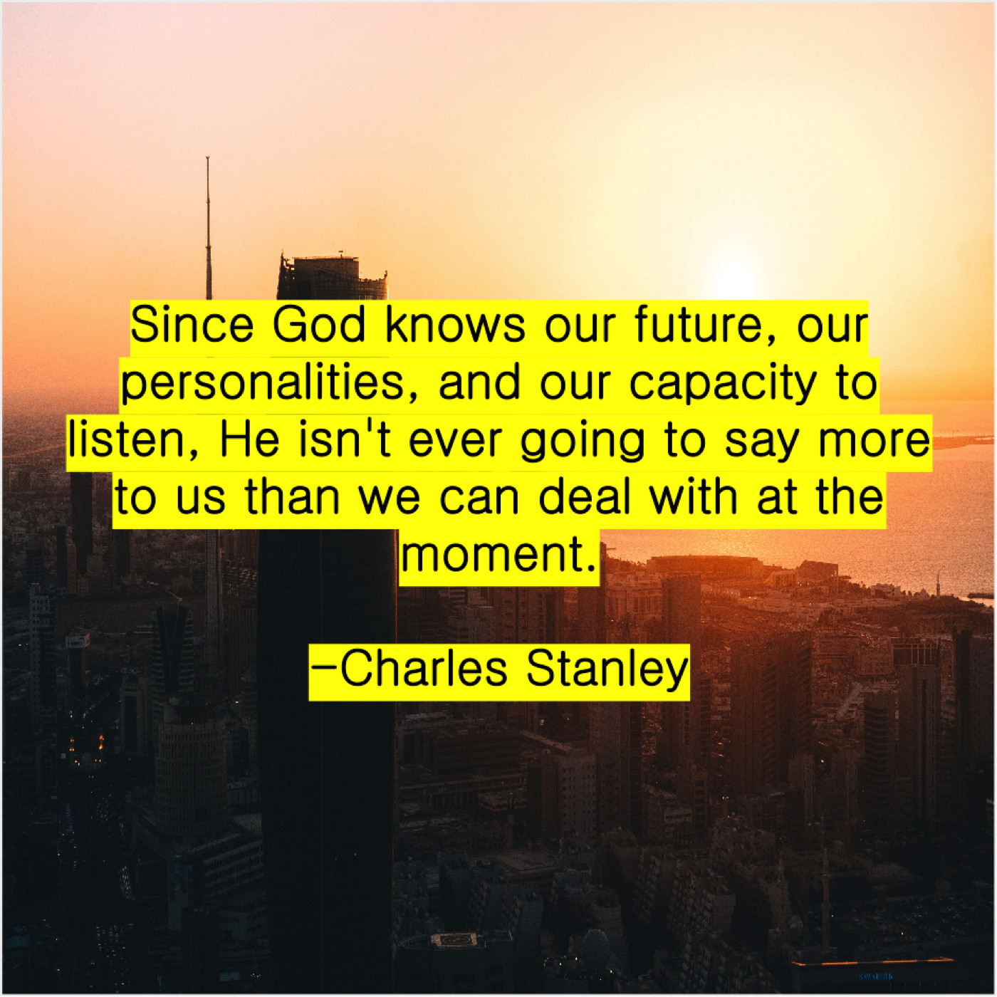 Charles Stanley Charles Stanley – Since God knows our future… July 7, 2019 admin “Since God knows our future, our personalities, and our capacity to listen, He isn’t ever going to say more to us than we can deal with at the moment.”-Charles Stanley